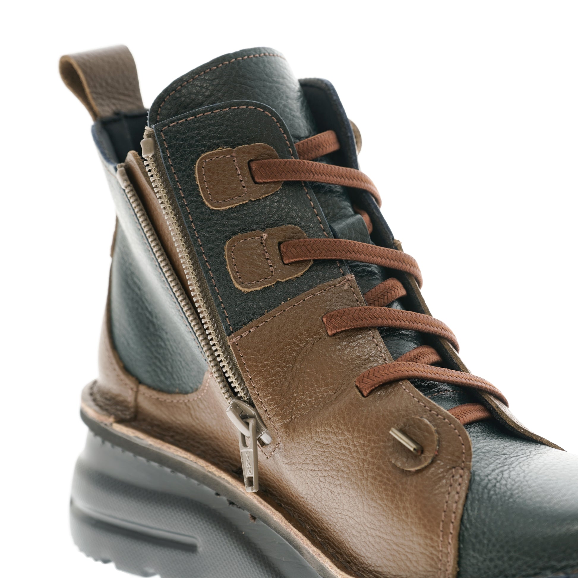 レースアップで微調整ができ、内側ジップ付きで着脱もスムーズです。