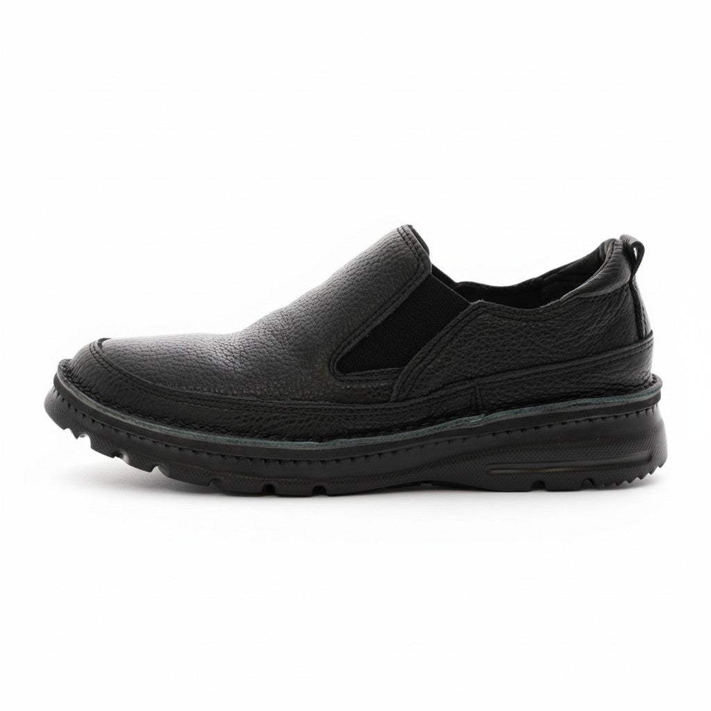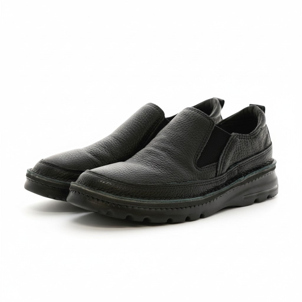 シャープすぎないスクエア感と上質なシボレザーが、足元に落ち着いた品格を添えるコンフォートスリッポン。